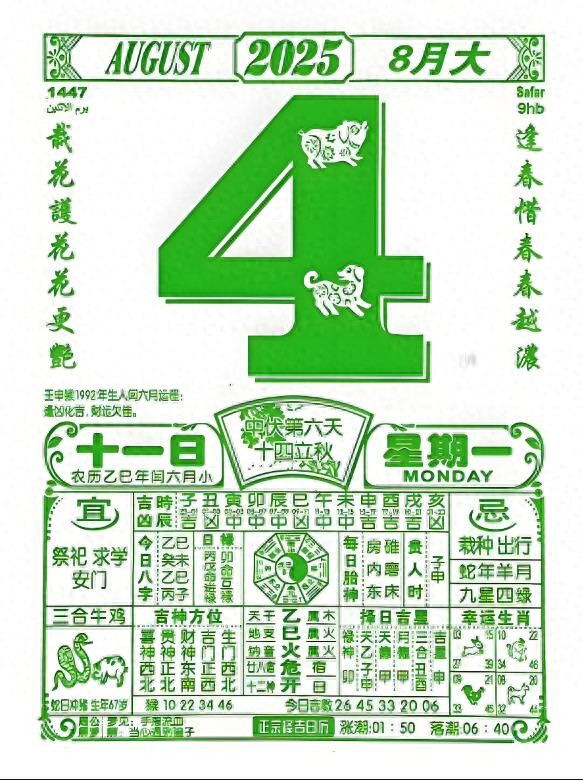 黄历心中过,遇事不出错。紧急通知,8月4日,星期一,比较不错的一天,可以先留着一句百事可行,祝福一下自己。今天执神是玉堂,适合进行开业,开始出行旅游,走亲访友拜访领导类的活动,包括求医问药、装修、动土、安门都是比较合适的。这天出门前记得收拾打扮一下自己穿戴得体的出门,包括烫染发美容美甲都是比较合适的。但是这天注意不要安修厨灶,注意紧慎管理财务,避免大额交易,避免钱财外借,以防破财。另外今天这个开日,这天可以开始一些新的计划,开始一些新的关系,近期想跳槽的,这天也可以。适当勇敢一些。不过开日气场活跃,容易激化矛盾,尽量不要打官司或者与人发生冲突。重要的事情可以安排在下午3点到5点避开,上午9点到11点,穿颜色推荐黄黑红蓝,不推荐绿白,打麻将的可以坐北边,求财找工作的可以去家的东南边看看,约会谈恋爱的可以约在家的西北边,生肖注意事项,小鼠疲惫不堪,小牛诸事顺遂,小虎求谋受阻,小兔心情不好,小龙精力充沛,小蛇工作顺利,小马不太乐观,小羊运势一般,小猴财库大开,小鸡获得器重,小狗特别沉稳,小猪一意孤行。八字分析,祝你开心,福生无量。