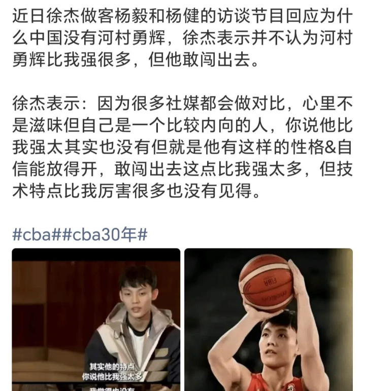 从国家队回归到广东宏远的后卫徐杰,做客杨毅和杨健的访谈节目回应为什么中国没有河村勇辉,徐杰表示并不认为河村勇辉比我强很多,但他敢闯出去。