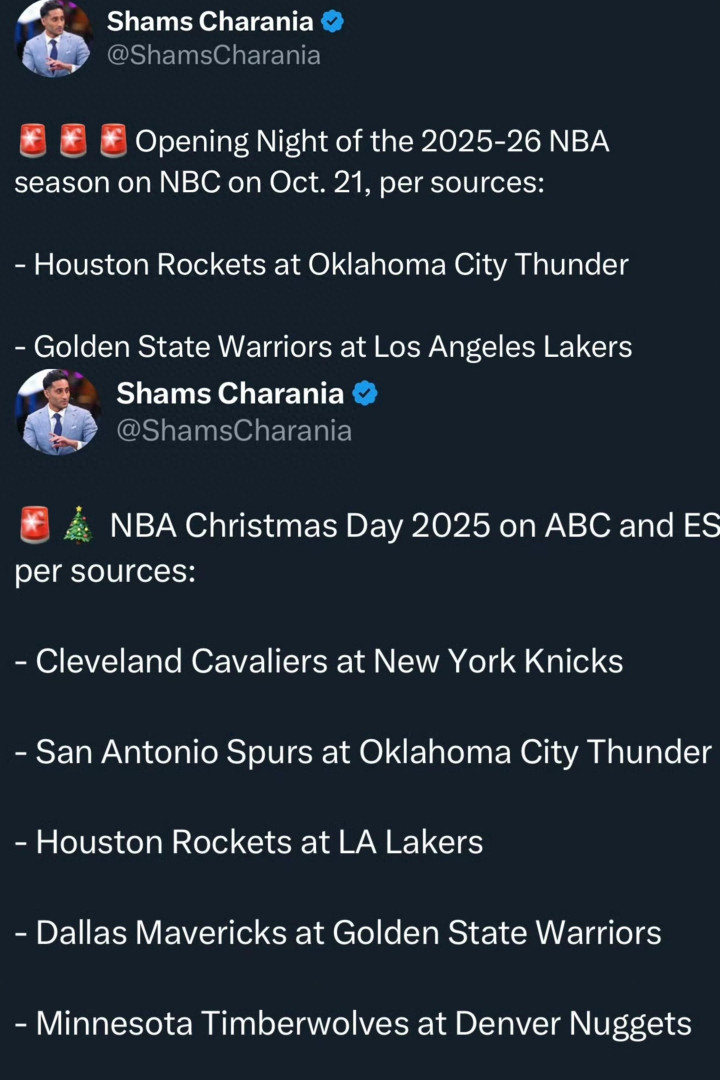 nba“爆料大王”Shams Charania透露了2025-26赛季nba常规赛的部分赛程。