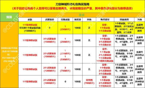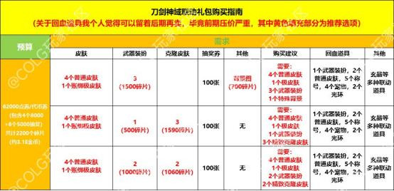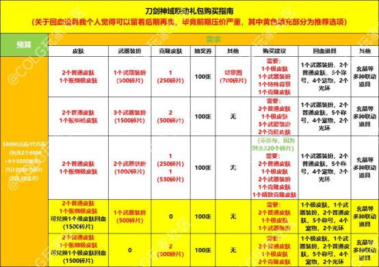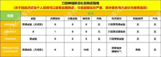 图中为四种预算表格,大家如果对克隆皮肤有需求的话,此时就可以考虑买礼包了,因为可以通过兑换材料进行兑换,如果是只需要一个克隆皮肤可以参考第二张表格,兑换1500碎片的极皮肤进行回血,回血率还是十分乐观的。