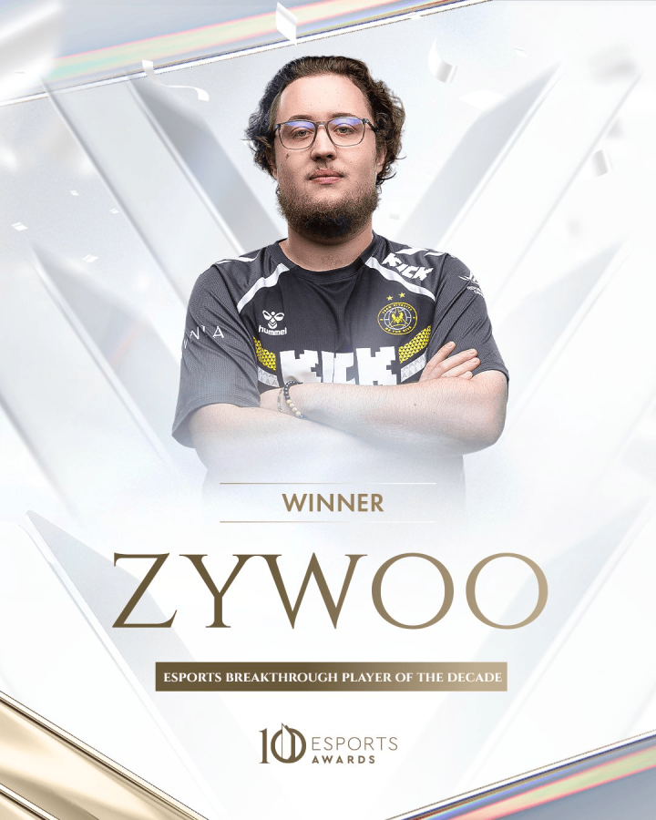 十年最佳电竞突破选手:ZywOo(该奖项旨在表彰那些在某一年突然爆发,或是职业生涯出道就打出高光表现并在之后持续保持高水平的选手)
