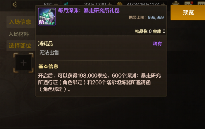 这不这次版本更新之后,大家在点击大深渊票的获取途径中就发现了一个新礼包。这个礼包可是之前体验服出现过的,不过后来被策划紧急下架了正式服也并没有更新。但没想到这个大深渊票礼包其实已经是通过更新内置到游戏中了,虽然并没有上架到商城,但可以预见的是策划并没有彻底放弃这个礼包。
