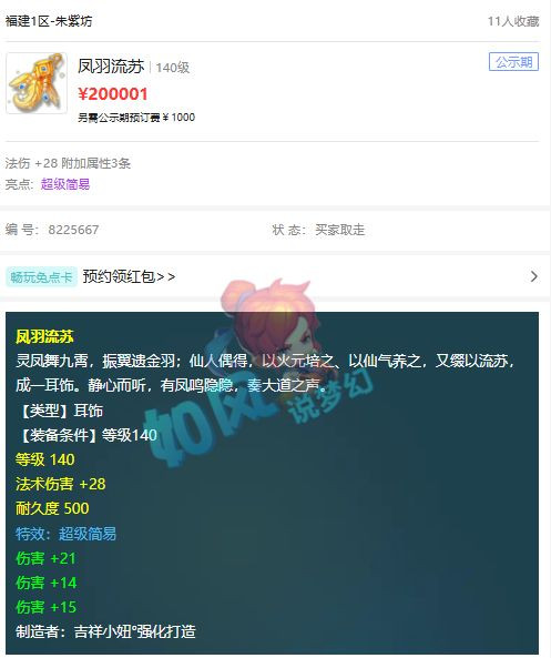朱紫坊这个140级的超级简易3伤害耳饰,主属性法伤,下排初始伤害达到了50点,最终以20万的价格卖出,对于九黎城门派来说,这样的耳饰性价比非常高。