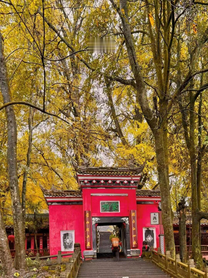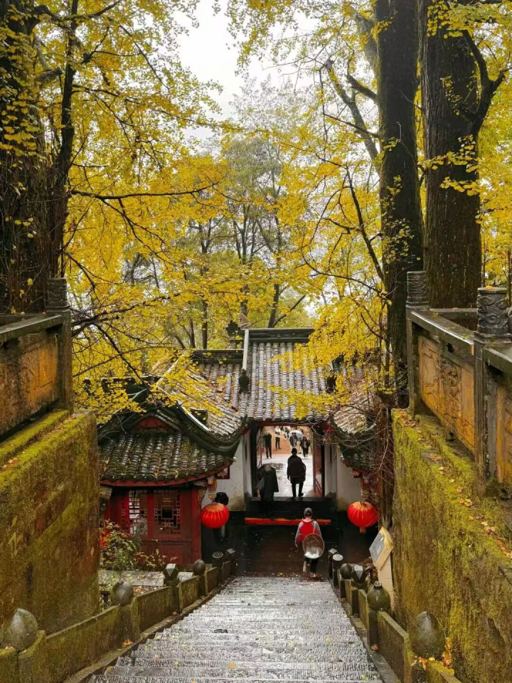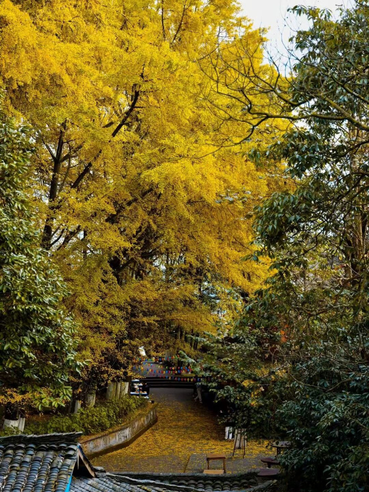 天盖寺隐于苍翠之间,十二株千年银杏环立,人称“蒙顶银杏12钗”,枝干虬劲,叶落如金雨,覆满石阶与屋檐,仿佛时光在此停驻。