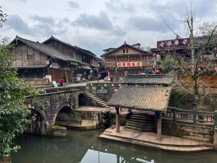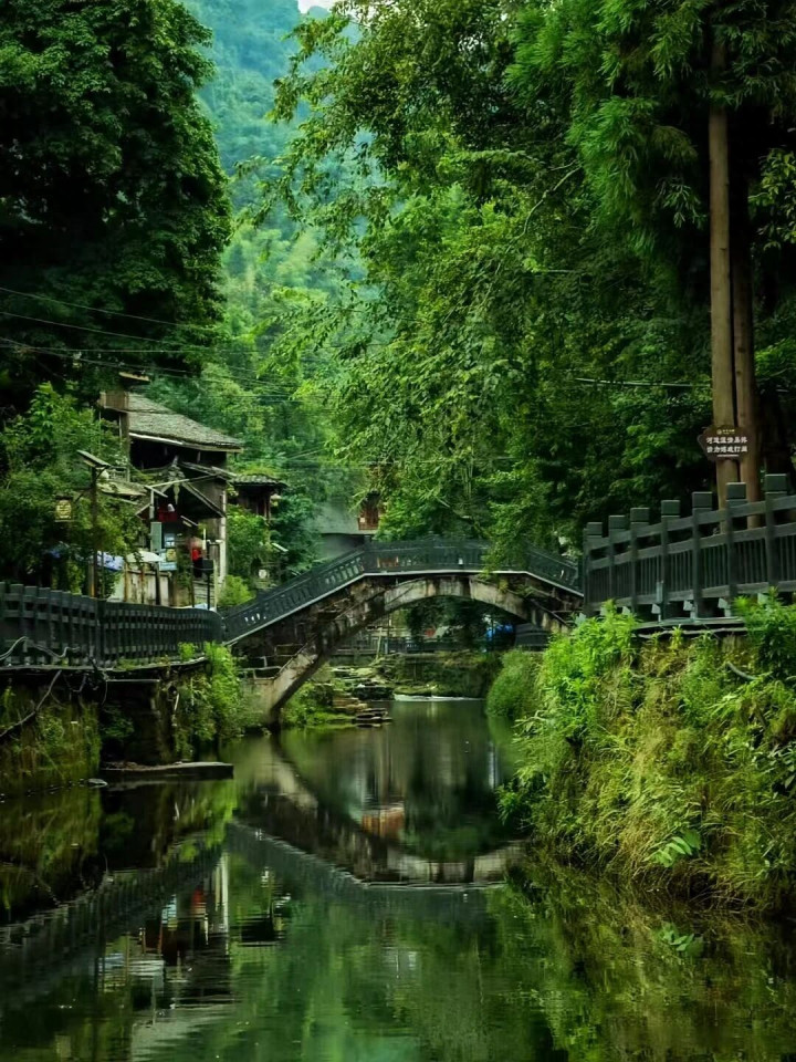 沿河缓行,水色如墨染宣纸,倒映着乾隆年间的立交桥,桥影微漾,虚实交错。石板路蜿蜒,两旁吊脚楼高挂红灯,晨昏时分,炊烟袅袅,如一缕未写完的诗行,飘入画中人家。