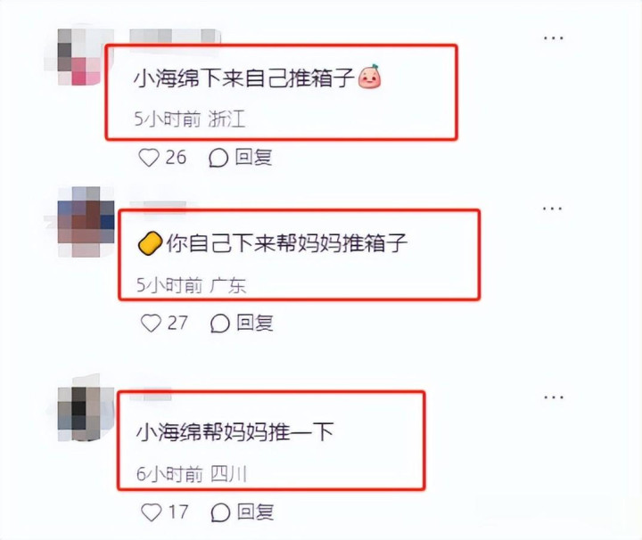 大家纷纷喊话:“这么大孩子了,怎么还坐在行李箱上”?“小海绵,你自己下来推着箱子,不要让妈妈推了”。