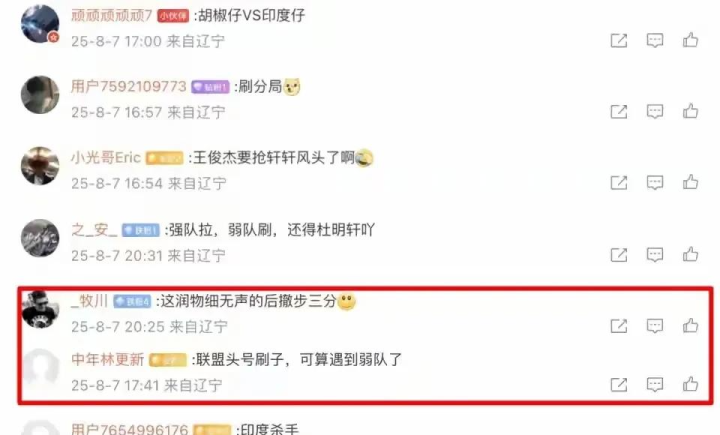 他们有的评论胡明轩“刷分局”、有的评论“王俊杰要抢胡明轩的风头了”、还有的评论“强队拉,弱队刷,还得胡明轩吖”,更有甚者,还评论道“联盟头号刷子,可算遇到弱队了。”