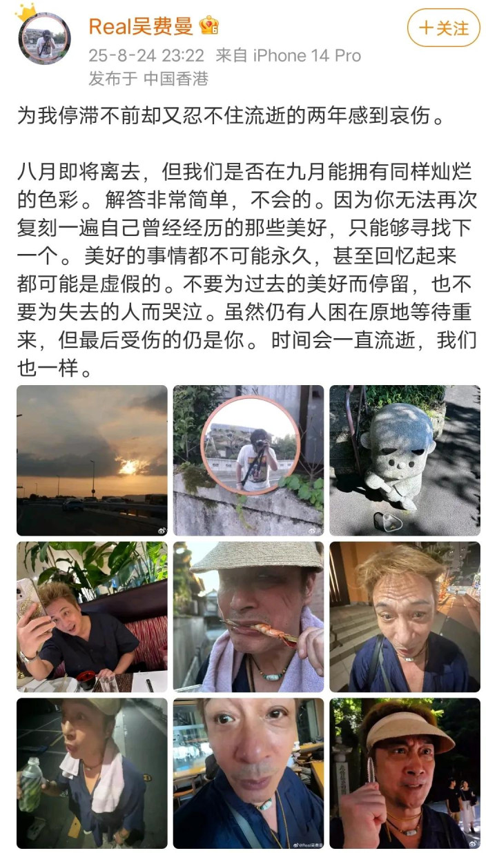 镜头前严肃高冷的吴镇宇,没想到在家里居然这么“活宝。8月24日,吴镇宇儿子费曼在其个人社交账号晒出一家人八月旅游的照片,吴镇宇带着妻儿去了日本福冈度假,一家三口的旅游打卡照拍得又搞笑又有创意,都学着青铜卧佛的姿势扶着脸,吴镇宇的黄发相当抢镜。