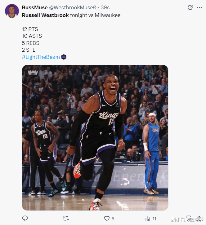 此役威少重返替补席,34分钟,14中4,三分5中0,罚球4中4,拿到12分10助攻5篮板2抢断5犯规1失误,命中率28.6%,三分命中率0%,正负值+14,威少打出国王生涯首次两双。