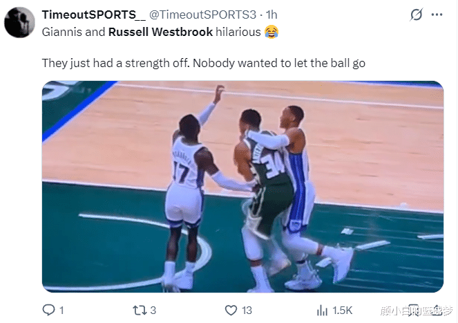 这场比赛威少还贡献了一个名场面,扬尼斯持球突破威少、施罗德两人,威少为了阻挡扬尼斯直接攻框,威少整个人挂在扬尼斯身上,这个熊抱也成为这场比赛最高光的点。