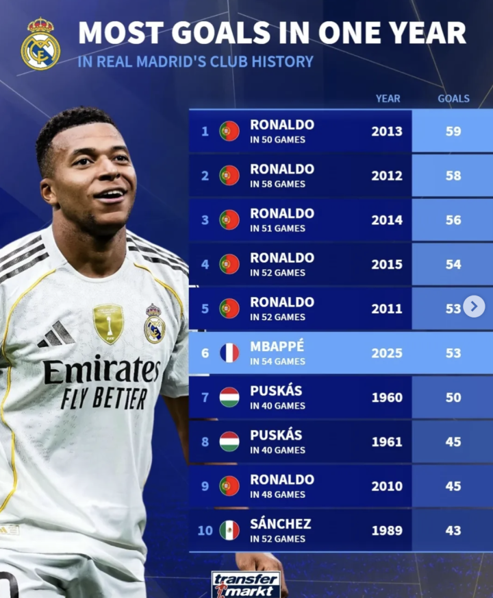前十中C罗占据前五席。姆巴佩在2025年已打入53球,已经可以排在第六位,并且还有机会打破C罗在2013年创造的59球队史纪录。