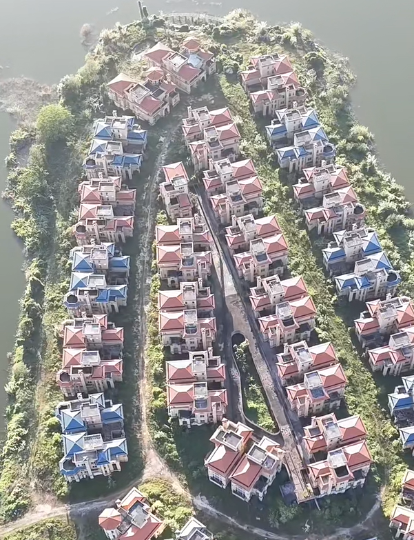 从空中俯瞰,那些未完成的地下空间如同岛屿暗处的伤口,沉默地敞开着。而那座精致的中式拱桥,通向的仿佛不是家园,而是另一段静止的岁月。