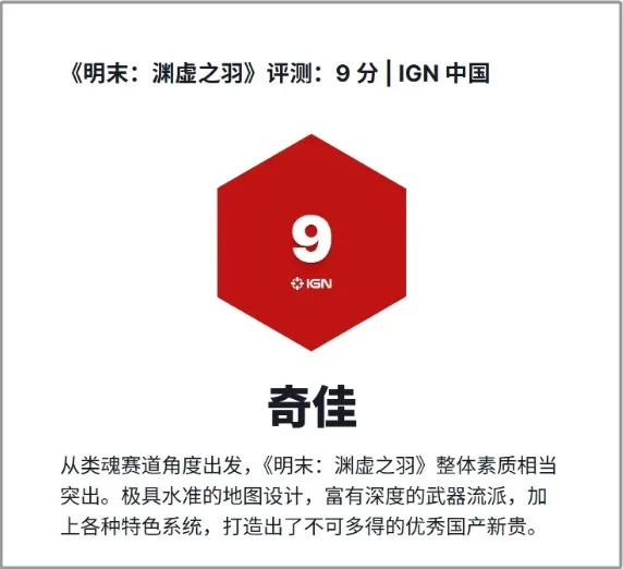 另外,IGN本家给出与《黑神话:悟空》一致的8分评价,认为其“为类魂游戏阵营再添佳作”,而IGN中国则给出了9分的高分评价(此前黑神话得分10分),认为其“从类魂赛道角度出发,《明末》整体素质相当突出。”