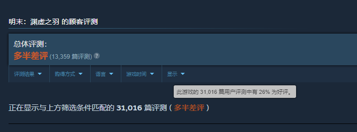 然而在《明末:渊虚之羽》发售后,由于优化问题,运营失误等多重问题,游戏短期口碑遭到重创,以中国玩家为主力的玩家大量给予游戏差评,游戏直接进入Steam差评榜前十,创下了热门游戏首发直接从畅销榜跌到差评榜的纪录。