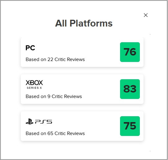 在这些优点的加持下,游戏发售前获得了媒体较高的评价,Metacritic平台显示,《明末》PS5版63家媒体评分综合为75分,Xbox版本收录9家媒体得分83,PC端22家评测得分76。而在全部三个平台中给予差评的媒体有3家,最低为40分。