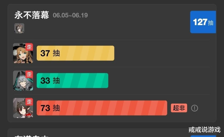 有很多玩家也分享了一下自己曾经抽酒神的悲惨经历,m3先抽干了一波,周年又下了个井,到抽酒神歪了俩彻底燃尽了我也知道他强但着实是捞不出来了,其实这样的玩家也不在少数,角的概率是真的迷。酒神为什么强,大白话来说主要是损伤这个赛道目前还没怎么被针对和没其他强力打损伤的,所以他现在很保值,投资他只是看损伤低水温秒小怪和全图支援的成分。