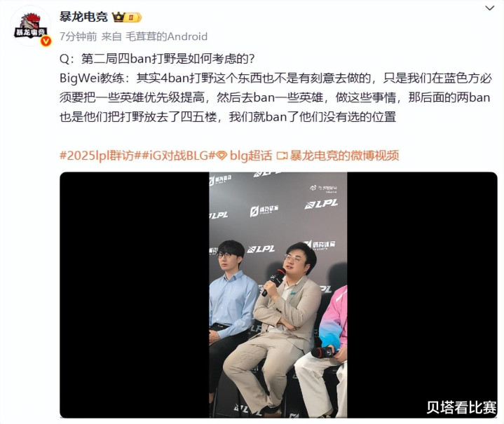败者采访的时候,BLG教练bigwei也谈到了4ban打野的原因,他表示:不是刻意这样BP的,只是在蓝色方必须要把一些英雄的优先级提高,后面两ban是因为IG没有选打野。