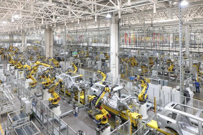 在赛力斯超级工厂里,机械臂不停舞动、运输机器人来回穿梭,一辆辆问界M9正在进行下线前最后的部件组装。这座超级工厂内,1600多台智能终端、3000多台机器人协同运作,实现了焊接过程自动化率100%、喷涂自动化率100%、全自动智能伺服压机线自动化率100%。