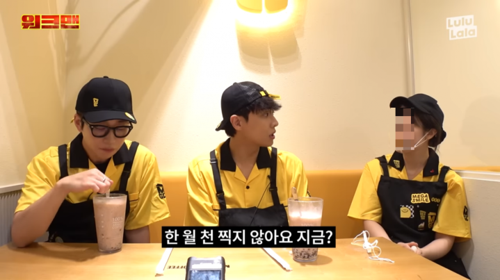 中途休息,便开始和店里的其他职员闲聊。DINDIN问店长“对这份工作有什么期望吗”。店长直言“希望能多给点钱”。一旁的李准惊讶的道“感觉会赚很多,每个月不能赚1000万韩元吗”