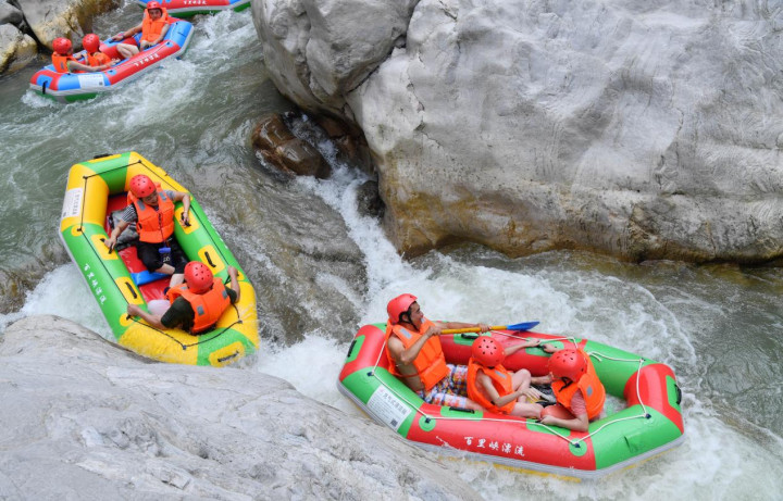 6公里的漂流河道从船儿石延伸至平桥,2小时的航程里,清冽河水时而平缓如镜,映着两岸青山;时而湍急奔涌,浪花拍打着橡皮艇,惊叫声与欢笑声混着水声回荡。这里既是冒险者挑战刺激的乐园,也是文艺爱好者抓拍“舟行碧波上”的天堂。