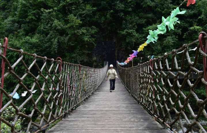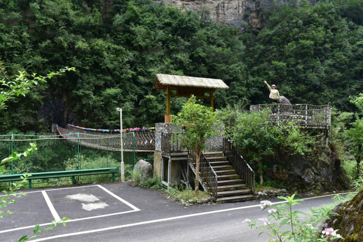 再行1公里至螺丝峡,这里是峡谷风光的精华所在。横跨小园河的“甩甩桥”晃晃悠悠,木板与铁索碰撞出清脆声响,低头是清澈见底的河水,抬头是峭壁如削的山景,十足的开州北部山区特色。绝壁上隐约可见古民居遗迹,添了几分神秘;道旁民宿推开窗便是峡谷,让“枕着溪声入眠”不再是想象。