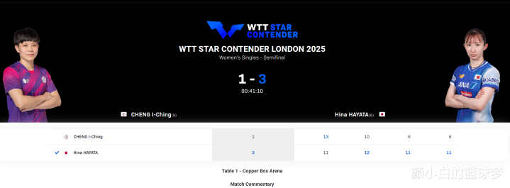 北京时间10月26日,WTT伦敦球星挑战赛女单半决赛,早田希娜3-1逆转郑怡静晋级决赛,四局比分:11-13、12-10、11-6、11-6。早田会等待张本VS桥本的胜者,所以日乒提前包揽冠亚。