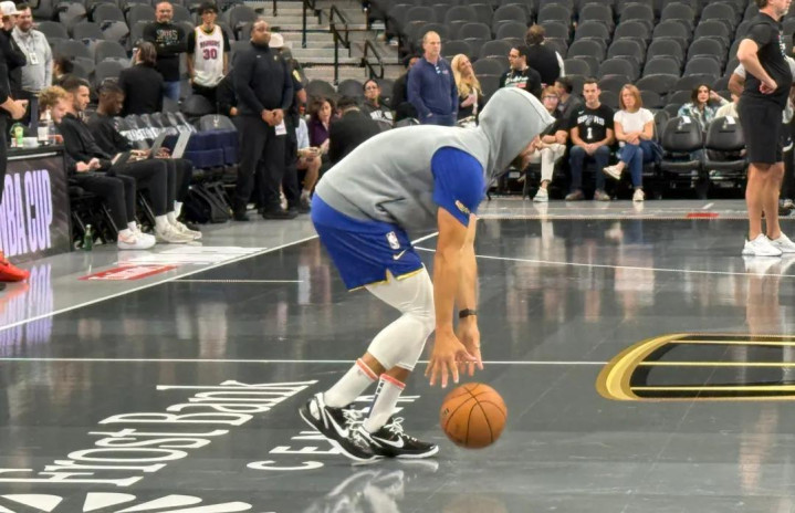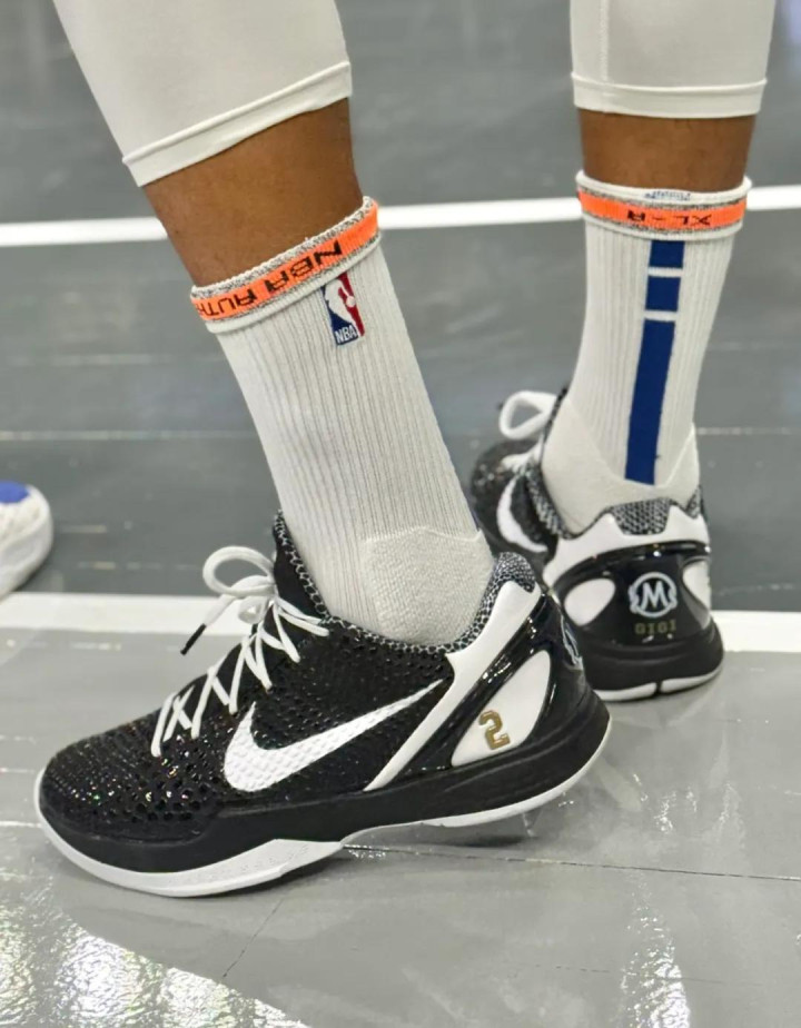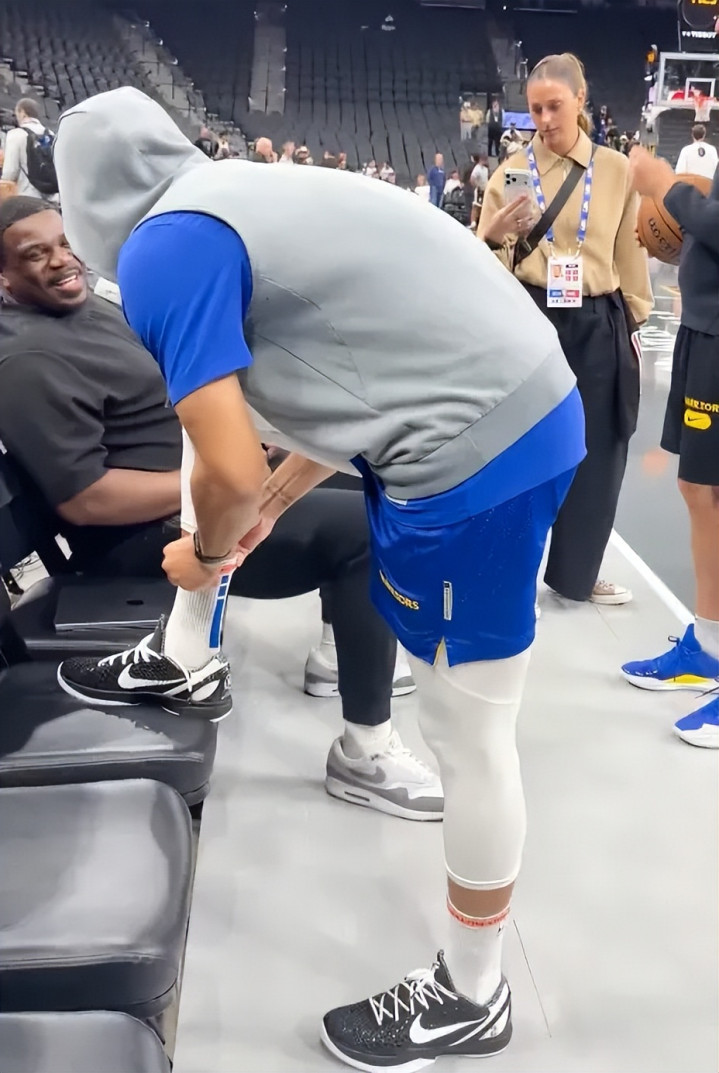 今天赛前热身的时候,库里就没再上脚UA的鞋子,而是穿上了耐克的科比6代(Gigi配色)。